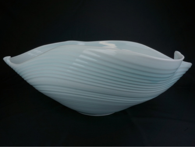 This work expresses natural scenes such as the movement of air and the flow of water. The gentle flow found in nature - curves representing water, wind, and life - gently envelop the light. The pure, clear blue brings silence and a time of prayer to the heart.