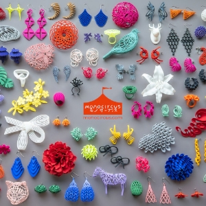 Leveraging their expertise in architecture and oil painting, monocircus creates structural and colorful fashion accessories using 3D printing technology. These pieces are “wearable art” designed to invigorate both the wearer and the observer.