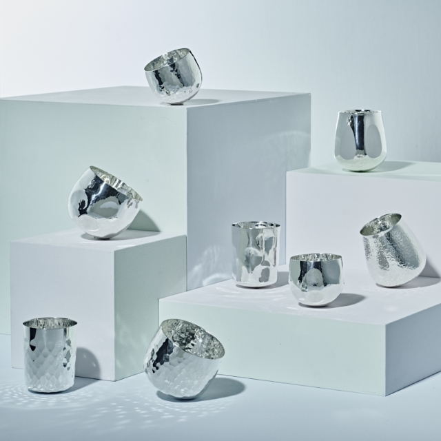 純銀の塊から板に叩き延ばし、器が完成する。模様は縦横の格子を鉄製の細いタガネを約20万回打ち付け市松模様が完成する。 市松模様は格子が続く事から「繋ぐ」「永遠」という意味が込められている。