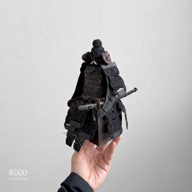 Black mizuhiki armor by Tsuda Mizuhiki Origata, birthplace of Kaga Mizuhiki. Approx. 24 cm with removable sword. A refined objet d’art for entryways or studies, striking under ambient light and fitting for Children’s Day gifts. Handcrafted variations lend singular presence. Respectfully crafted by 5th-generation Rokusuke Tsuda.