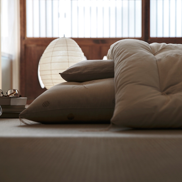 “Tools for Finding Calm Anywhere.” Born from the hands of a futon craftsman, the “Zafu” and “Chabako.” The Zafu is a small cushion that lets you calm your mind wherever you are. The Chabako is a box in which the softness of fabric carries the craft of futon-making. Together, they offer a form for quietly facing stillness in everyday life.