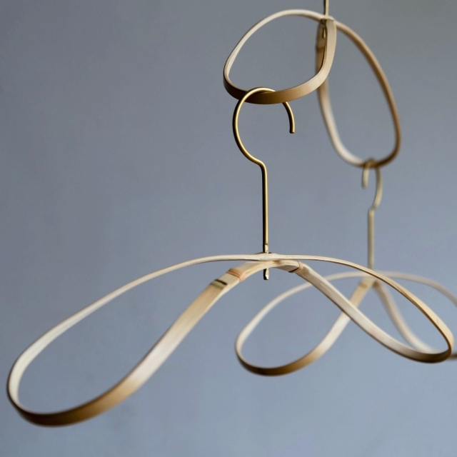 The product is made from high-quality green bamboo from Takehara City, Hiroshima Prefecture. Utilizing the lightness and flexibility of bamboo, it is molded into a three-dimensional figure-eight shape to add strength. The hook is made of brass, which blends in well with the material. The form captures and contains the air, giving it the impression of a mobile, and by connecting the pieces in a triangular structure, it can actually become a moblie. The green bamboo base of the main body will gradually turn amber and acquire a glossy finish over time. We hope that you will enjoy the natural texture that changes over time, and that this hanger will be a beautiful companion to your home. mobile.